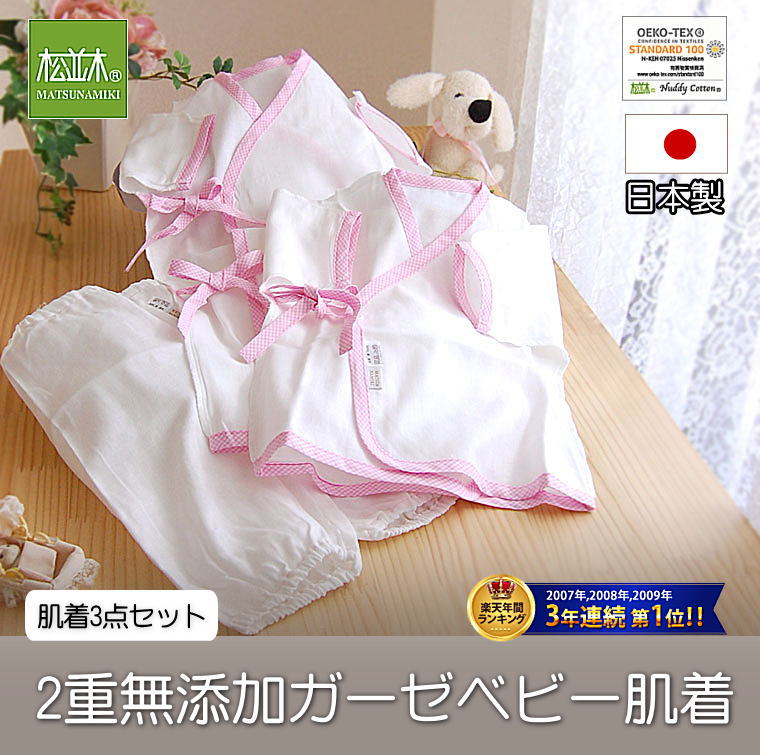 楽天1位 新生児 肌着3点セット 無添加ガーゼ 2枚仕立て 縁/ブルー、ピンク、イエローチェック/長肌着 短肌着 ズボン 3点セット 松並木 日本製綿100%無添加 ガーゼ【Nuddy Cotton】ガーゼ2重ベビー アレルギー敏感肌アトピーの方にも丸洗いOK肌荒れ寝汗対策吸汗&速乾